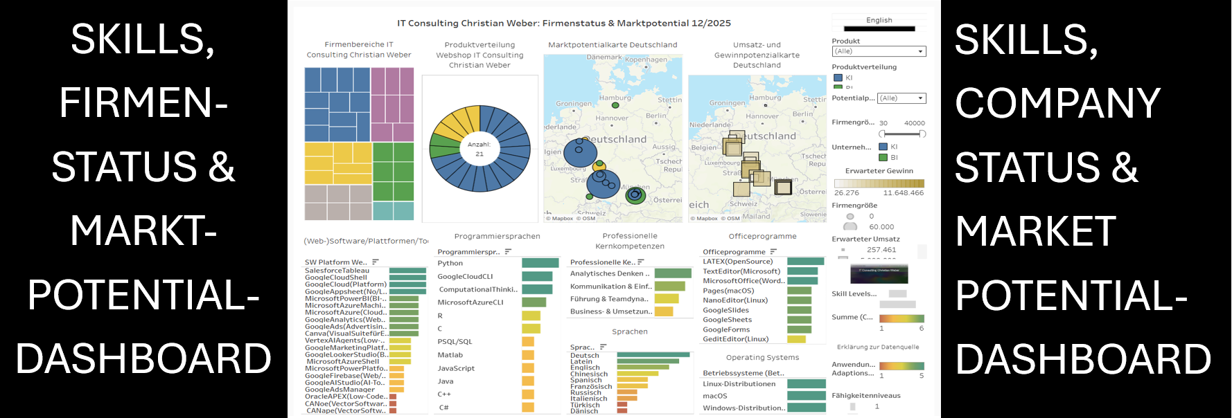Firmenname IT Consulting Christian Weber mit Füllung der 5 verschiedenen Firmenbereiche sowie entsprechende Hintergrundeinfärbung mit Farbcodierung in Bereich-Fokus-Gewichtung